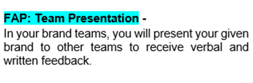 Attendance – After thoroughly briefing teams and providing ample research time during taught sessions, I was confident in their presentation skills. To reduce attendance issues during FAP sessions, I scheduled morning and afternoon sessions, therefore reducing audience size and potentially easing nerves for presenters, encouraging more support from peers. However, students were invited and encouraged to attend all day if they wished as they would benefit much from seeing a variety of presentations. Overall this worked well and only one student was absent from the session.