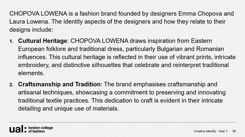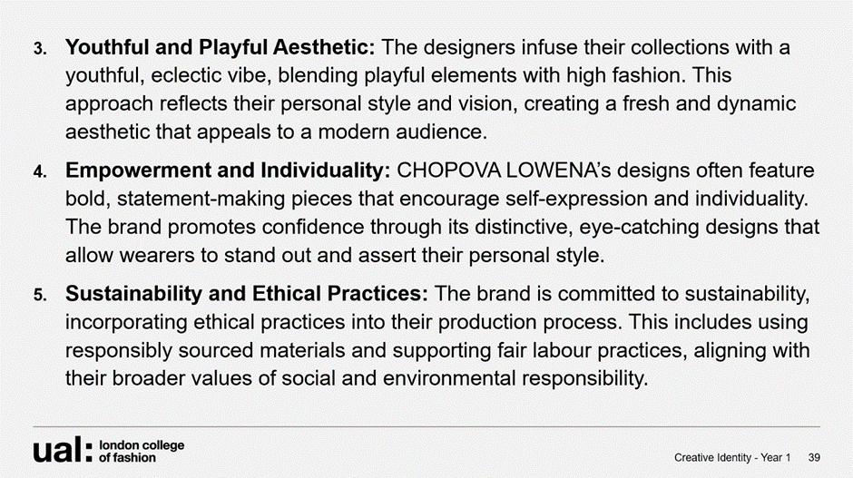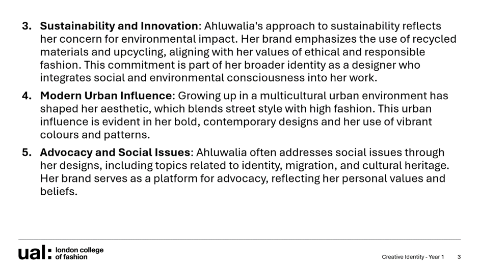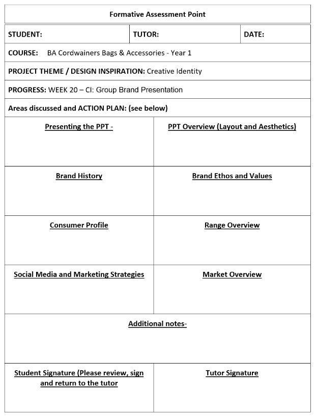 For my final case study on Assessing learning and exchanging feedback, I will discuss a recent Formative Assessment Point (FAP) from the Year 1 BA Bags & Accessories ‘Creative Identity’ unit. Following the Briefing students research designer brands in their teams, compiling findings into a 15-page presentation, before finally presenting the brand to their peers. (University of the Arts London, 2023)