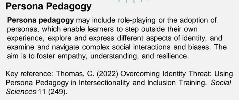 Thomas, C. (2022) Overcoming Identity Threat: Using Persona Pedagogy in Intersectionality and Inclusion Training. School of Social Works & Arts, Faculty of Arts & Education, Charles Sturt University, Wagga Wagga 2678, Australia. Available at: https://www.mdpi.com/2076-0760/11/6/249 (Accessed: 26 July 2024).