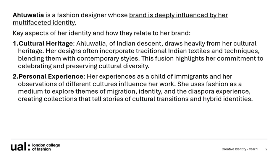 Inclusive Curriculum: Reviewing the session to ensure I include examples of perspectives from diverse representation (Chalmers, F.G. 1996), it’s also important to ensure the examples are culturally relevant so students relate to the content. I have examples of designers who use their own identity within their work to create their brand’s USP to help students understand the task and inspire creativity (Appendix 3).