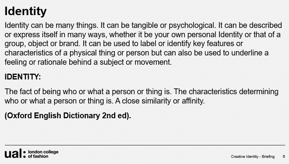My first task for this unit is ensuring the students understand the brief (Briefing PowerPoint Appendix 3), this includes understanding the meaning of Identity –